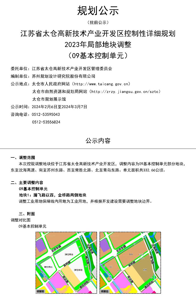 江蘇省太倉(cāng)高新區(qū)技術(shù)產(chǎn)業(yè)開(kāi)發(fā)區(qū)控制性詳細(xì)規(guī)劃2023年局部地塊調(diào)整(09基本控制單元)批前公示