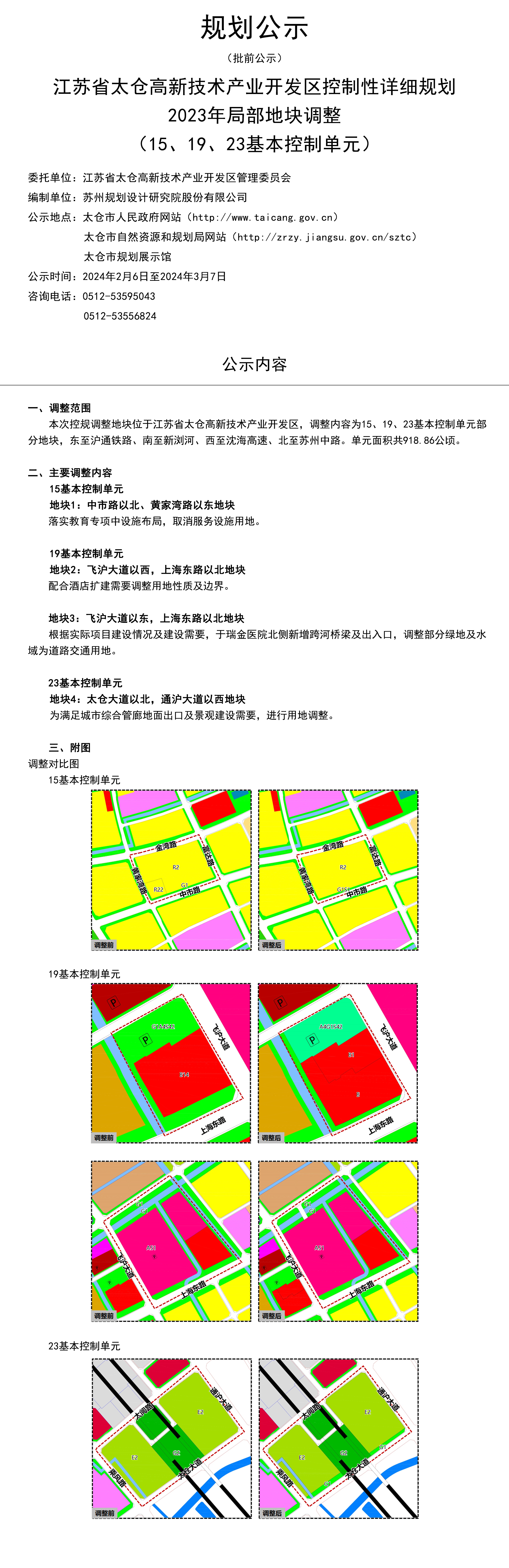 江蘇省太倉高新區技術產業開發區控制性詳細規劃2023年局部地塊調整(15、19、23基本控制單元)批前公示