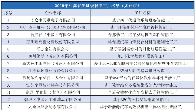 近日,江蘇省工信廳公示了2025年江蘇省先進級智能工廠名單,太倉市13家企業成功入選。