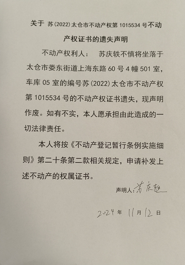 關于蘇(2022)太倉市不動產權第1015534號不動產權證書的遺失聲明