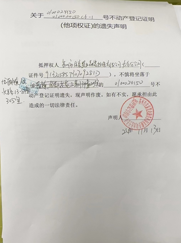 關(guān)于0100024150號不動產(chǎn)登記證明(他項權(quán)證)的遺失聲明