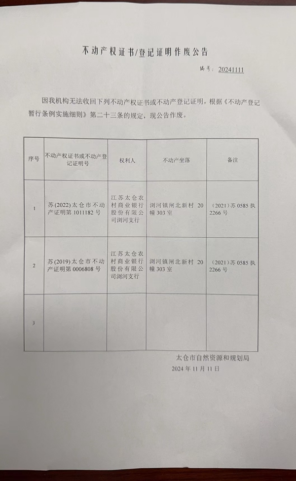 不動產(chǎn)權(quán)證書/登記證明作廢公告(編號:20241111)