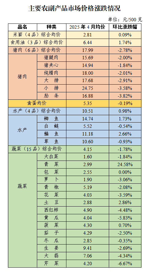 四月,太倉主副食品價格整體平穩。糧油價格基本穩定,蛋肉價格略微下降,淡水魚價格波動較小,蔬菜價格以降為主,具體情況如下: