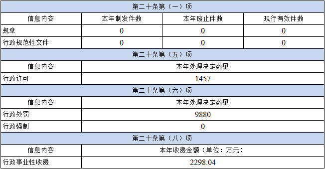根據《條例》要求,在太倉市人民政府門戶網站及時主動公開各類公示公告、部門工作動態、重要會議活動、重大決策事項、重要政策條款等事項。2023年全年公開政府信息263條,其中區鎮動態205條、政策文件58條。本年度未涉及規章和行政規范性文件的制發或廢止工作。全年批準辦結行政許可事項1457件,其中市政設施建設類審批94件,戶外廣告設置審批839件,城鎮污水排入排水管網許可295件,臨時性建筑物搭建、堆放物料、占道施工審批55件,臨時占用城市綠化用地審批3件,公共場所衛生許可155件,實行不定時工作制和綜合計算工時工作制審批16件。處理行政處罰案件9880起、行政強制0起,主要涉及農業農村、水利水務、城管領域;行政事業性收費2298.04萬元。
