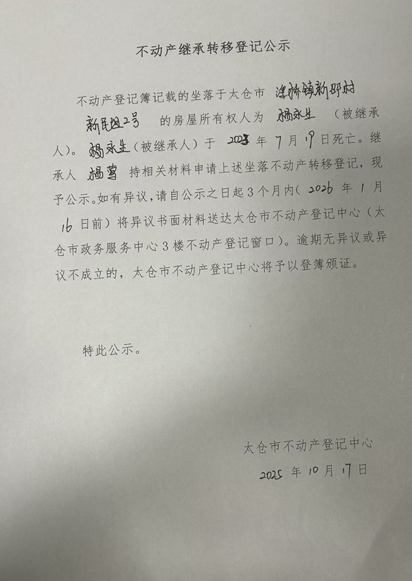 不動產(chǎn)繼承轉(zhuǎn)移登記公示