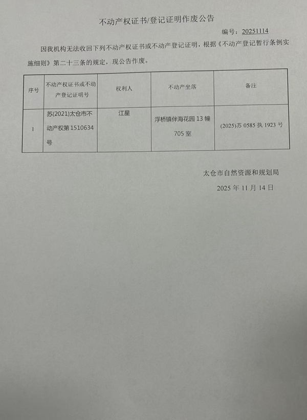 不動產權證書/登記證明作廢公告(編號:20251114)