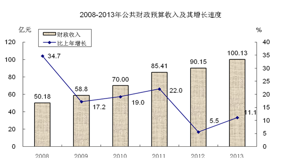 全年完成公共財政預算收入100.13億元,比上年增長11.1%;其中稅收收入82.12億元,增長13.1%。公共財政預算支出92.36億元,增長7.2%。