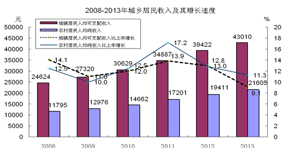 全年城鎮居民人均可支配收入43010元,農村居民人均純收入21605元,分別比上年增長9.1%和11.3%。城鎮居民人均生活消費支出28420元,農村居民人均生活消費支出15102元,分別增長4.8%和15.4%。城鄉居民食品支出占生活費支出的比重(恩格爾系數)分別為34.0%和32.6%。