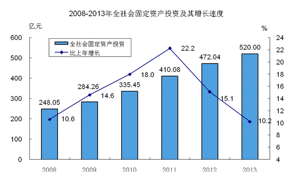 全年完成全社會固定資產投資520.00億元,比上年增長10.2%。其中,工業投資258.94億元,增長9.3%;服務業投資261.02億元,增長11.0%。高新技術產業投資43.38億元,新興產業投資145.43億元,占工業投資的比重分別為16.8%和56.2%。分地區看,城鎮投資351.31億元,增長6.2%;農村投資168.69億元,增長19.5%。