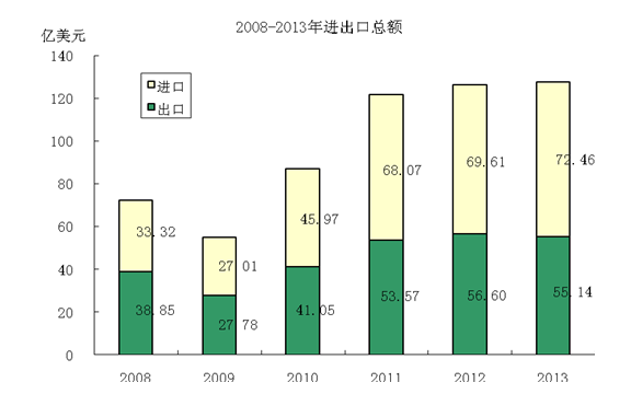 全年實現進出口總額127.71億美元,比上年增長1.1%,其中出口總額55.19億美元,下降2.5%;進口總額72.52億美元,增長4.0%。