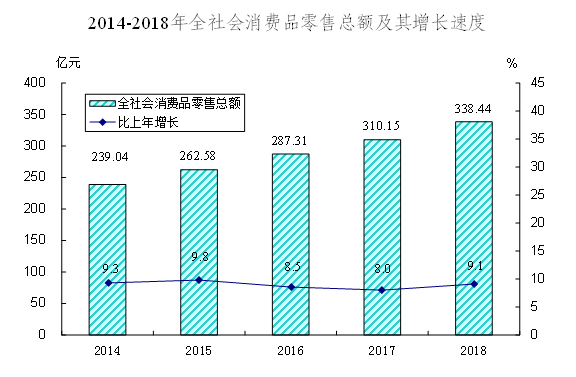 全年實現社會消費品零售總額338.44億元,比上年增長9.1%。按消費形態統計,批發和零售業零售額290.51億元,增長9%;住宿和餐飲業零售額47.93億元,增長9.6%。按經營地統計,城鎮消費品零售額219.43億元,鄉村消費品零售額119.01億元,分別增長9%和9.3%。