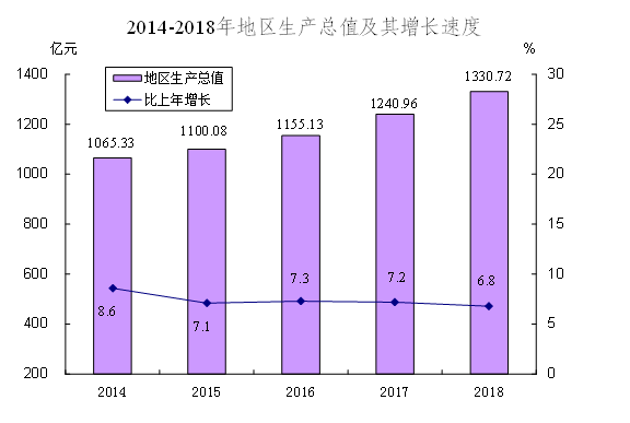 2018年,全市實現地區生產總值1330.72億元,按可比價格計算,比上年增長6.8%。其中,第一產業增加值34.98億元,下降3.6%;第二產業增加值675.47億元,增長6.4%;第三產業增加值620.27億元,增長7.7%。按常住人口計算,人均地區生產總值18.55萬元。第一產業增加值占地區生產總值的比重為2.6%,第二產業增加值比重為50.8%,第三產業增加值比重為46.6%。