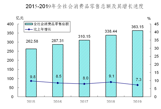 全年實現社會消費品零售總額363.15億元,比上年增長7.3%。按消費形態統計,批發和零售業零售額312.24億元,增長7.5%;住宿和餐飲業零售額50.91億元,增長6.2%。按經營地統計,城鎮消費品零售額235.57億元,鄉村消費品零售額127.58億元,分別增長7.4%和7.2%。