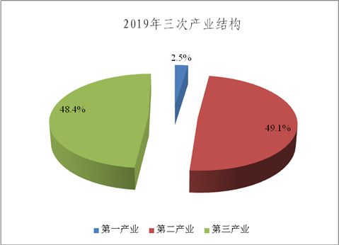 2019年,全市實現地區生產總值1324.97億元,按可比價格計算,比上年增長5.4%。其中,第一產業增加值32.59億元,下降4.0%;第二產業增加值651.10億元,增長5.1%;第三產業增加值641.29億元,增長6.3%。按常住人口計算,人均地區生產總值18.40萬元。第一產業增加值占地區生產總值的比重為2.5%,第二產業增加值比重為49.1%,第三產業增加值比重為48.4%。