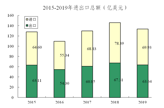 全年實現進出口總額133.57億美元,比上年下降8.3%,其中出口總額63.64億美元,下降5.5%;進口總額69.93億美元,下降10.8%。