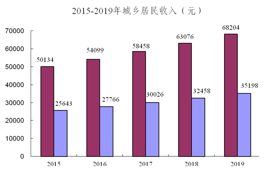 全年城鎮居民人均可支配收入68204元,農村居民人均可支配收入35198元,分別增長8.1%和8.4%。城鎮居民人均生活消費支出39187元,農村居民人均生活消費支出23762元,分別增長5.4%和7.0%。城鄉居民食品支出占生活費支出的比重(恩格爾系數*)分別為28.9%和29.0%。