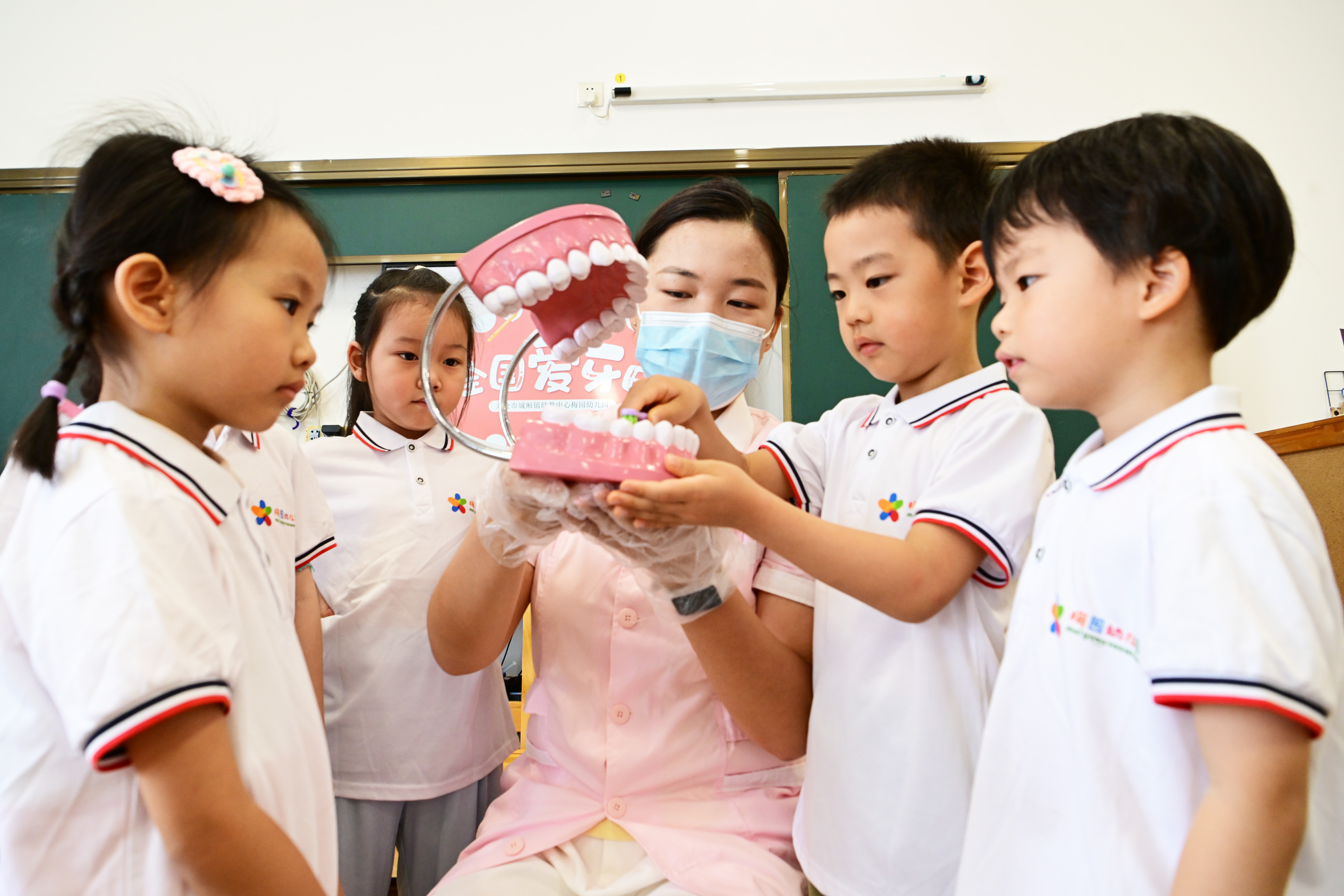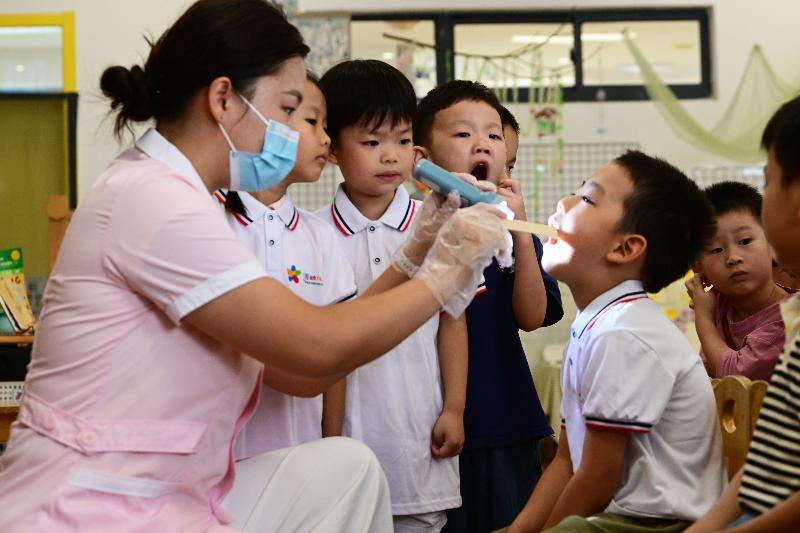 9月19日,梅園幼兒園保健老師指導小朋友如何正確刷牙。9月20日是第三十七個“全國愛牙日”,今年的宣傳主題是“口腔健康全身健康”。為此,我市開展教育宣傳活動,講解護牙知識,倡導小朋友養成愛牙護牙的良好生活習慣。
