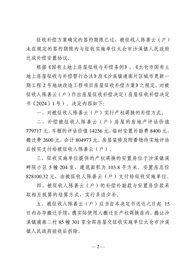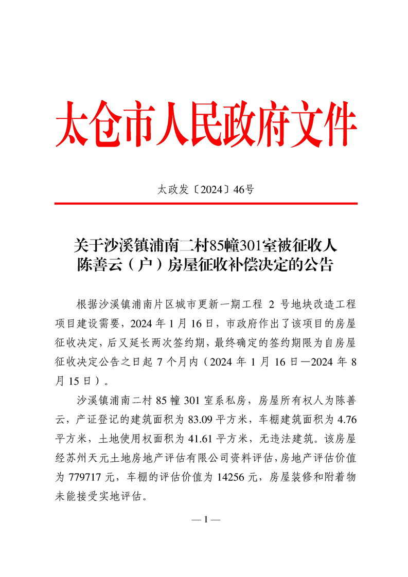 關(guān)于沙溪鎮(zhèn)浦南二村85幢301室被征收人陳善云(戶)房屋征收補(bǔ)償決定的公告
